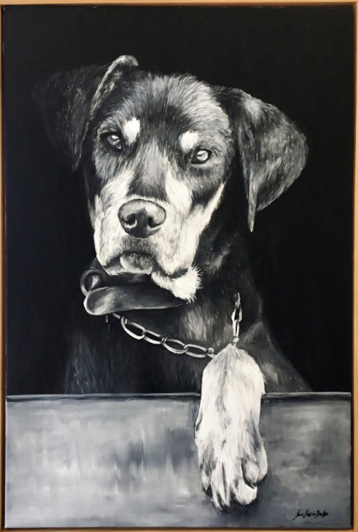 This expressive acrylic painting captures a moment of calm in the life of a Huntaway dog, rendered in a striking monochrome palette. With its head gently tilted and one paw draped over a ledge, the dog gazes forward with soulful eyes—alert, intelligent, and quietly watchful. With restraint and realism, the painting honours the quiet strength and noble character of this working breed.