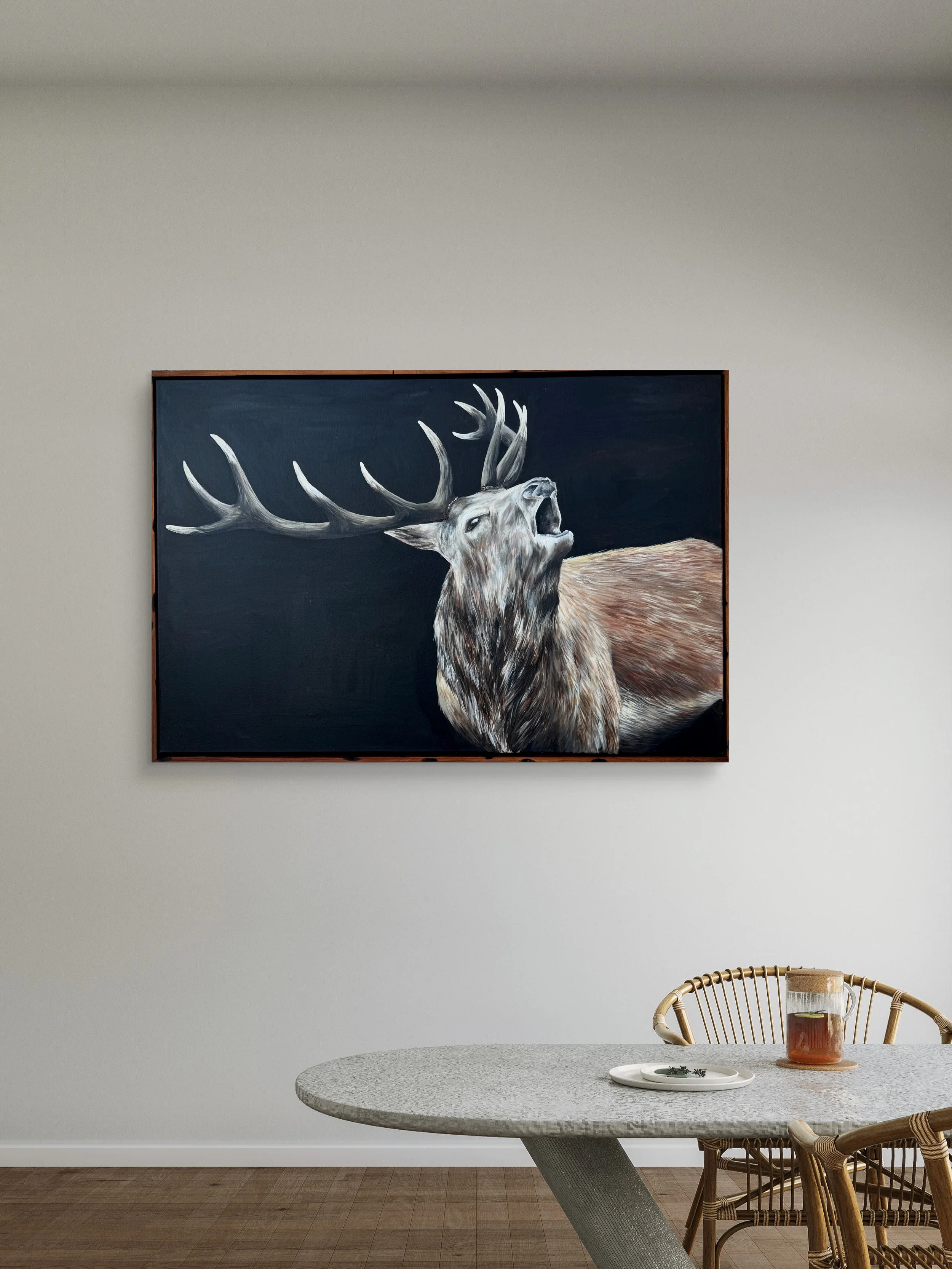 This painting captures a powerful red stag mid-roar, its head raised and mouth open in a striking display of strength and presence. The stag’s rich, textured fur and wide antlers are painted in warm, earthy tones, standing out against a dark, minimal background. The artist uses bold brushstrokes and strong contrast to highlight the animal’s form and energy, creating a dramatic and expressive portrait of one of nature’s and hunters most iconic trophy’s..