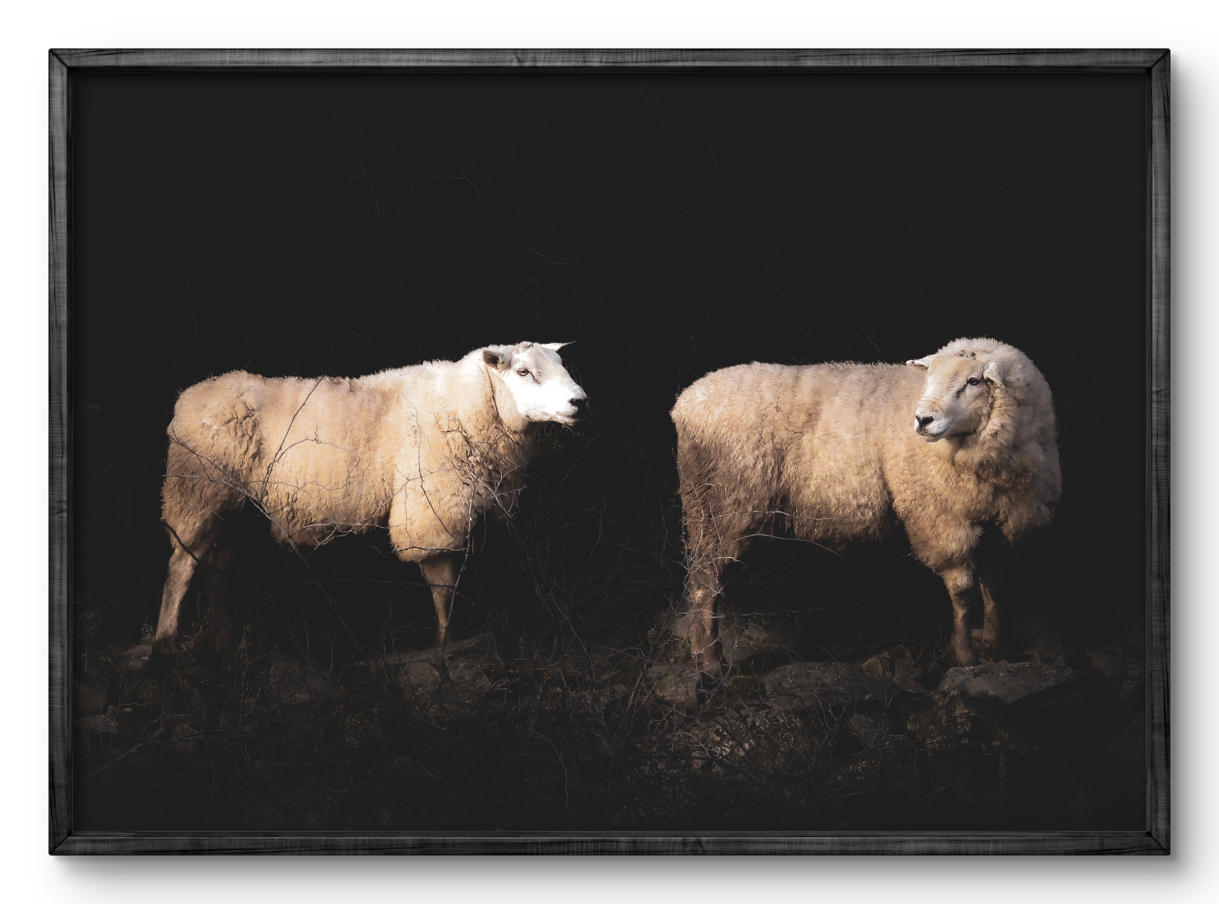 Bring a touch of rural elegance to your space with Midfield Standstill — a striking portrait of two Texel rams bathed in soft, natural light against a moody, darkened backdrop. Midfield Standstill captures a fleeting rural stillness — a visual pause that speaks to quiet encounters and life lived in the margins of the land. The bare undergrowth and rugged terrain hint at resilience, while the sheep’s gaze creates a dialogue that is both ordinary and profound.